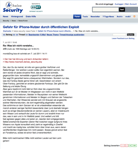 Der "sierkb" ist so verbissen damit beschäftigt, mir nicht "auf den Leim zu gehen", daß er allen anderen dabei auf den Leim geht. Zum Beispiel einer Seite, auf die ich hier eingehe, auf die er sich bezogen hat, weil sie ihm glaubwürdiger als meine Seite vorkam. Sie erörtert ebenfalls die Sicherheit von Mac OS X und er hält sie für eine schöne Zusammenstellung und Zusammenfassung. Tatsache ist jedoch, daß dort glatte Lügen verbreitet werden, sei es aus Unkenntnis oder Trollerei. Peinlich, so einer Seite mehr Glauben zu schenken. Schade, daß viele die geschriebenen Dinge nicht selbst prüfen und mir lieber Voreingenommenheit unterstellen. Ich habe dann gezeigt, was dort falsch ist.